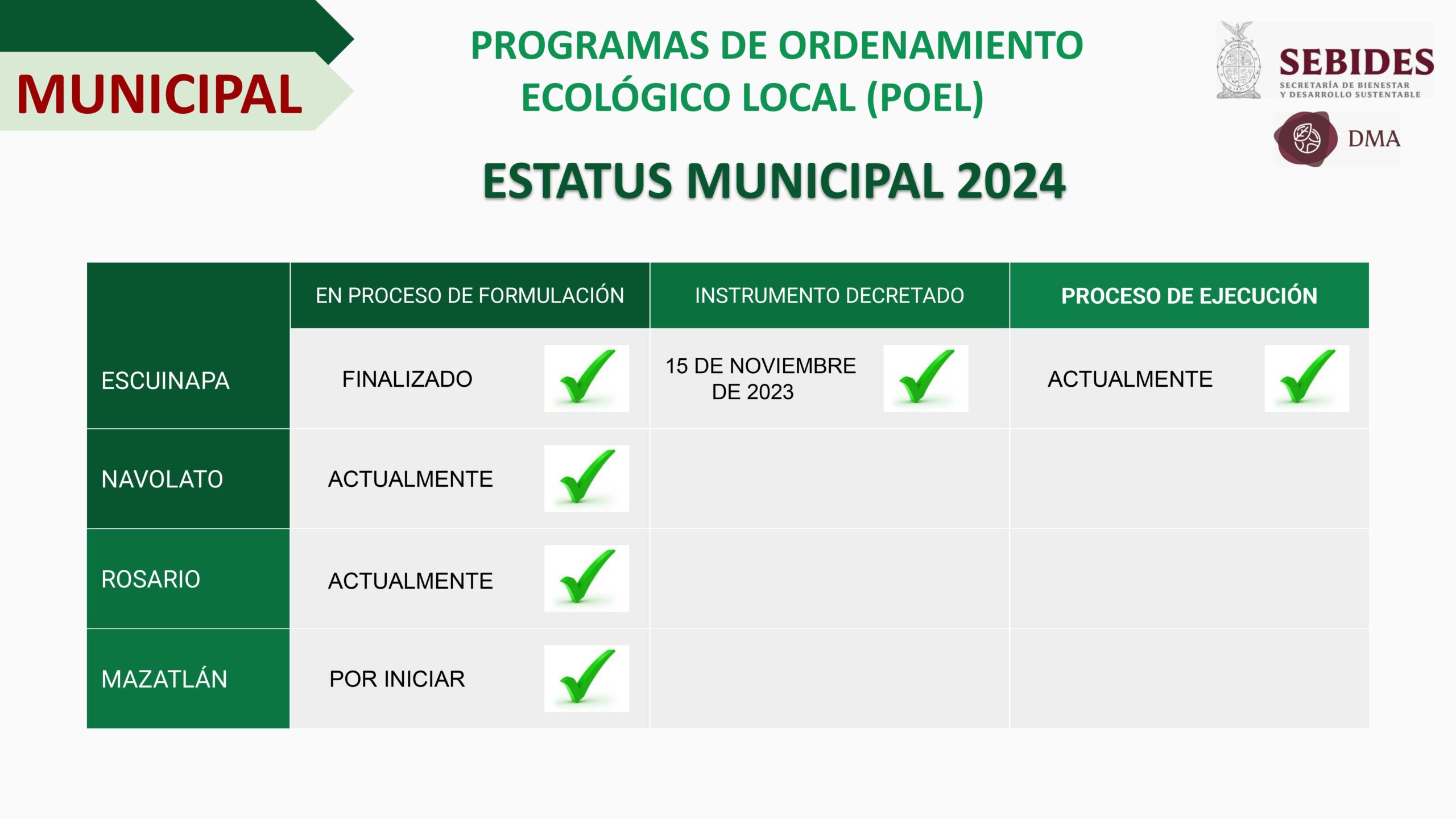 En cuanto a los ordenamientos territoriales en los municipios, la dependencia informó que actualmente se encuentran instalados 15 consejos municipales de ordenamiento territorial, entre ellos Mazatlán. En el caso de los programas de ordenamiento ecológicos municipales, solo el municipio de Escuinapa cuenta con este instrumento; y Mazatlán apenas está por iniciar su proceso de formulación.