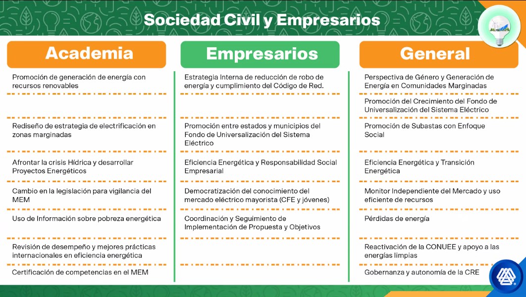 Carlos Aurelio Hernandez Gonzalez, presidente de la Comisión Nacional de Energía de la Coparmex, explicó que su propuesta se basó en responder cuatro preguntas esenciales para el país: ¿Qué es lo mejor para el país en términos ambientales? ¿Cómo logramos una verdadera democratización del mercado eléctrico mayorista para tener a 10 millones de hogares generando? ¿Cómo ponemos en el centro a las personas? y ¿Cómo fortalecemos la CFE?.