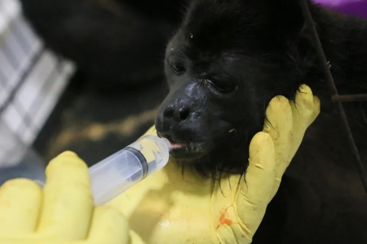 Un veterinario alimenta a un joven mono aullador rescatado en medio de temperaturas extremadamente altas en Tecolutilla, estado de Tabasco, México, el martes 21 de mayo de 2024. Foto: Luis Sánchez