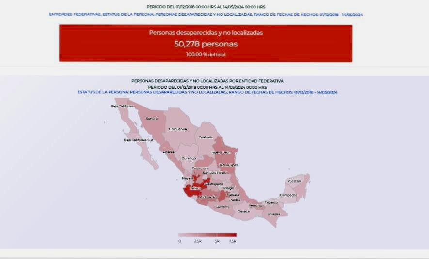 Foto de portada: Captura del Registro Nacional de Personas Desaparecidas y No Localizadas tomada el 14 de mayo, cuando se rebasó la cifra de 50,000 desapariciones en el sexenio.