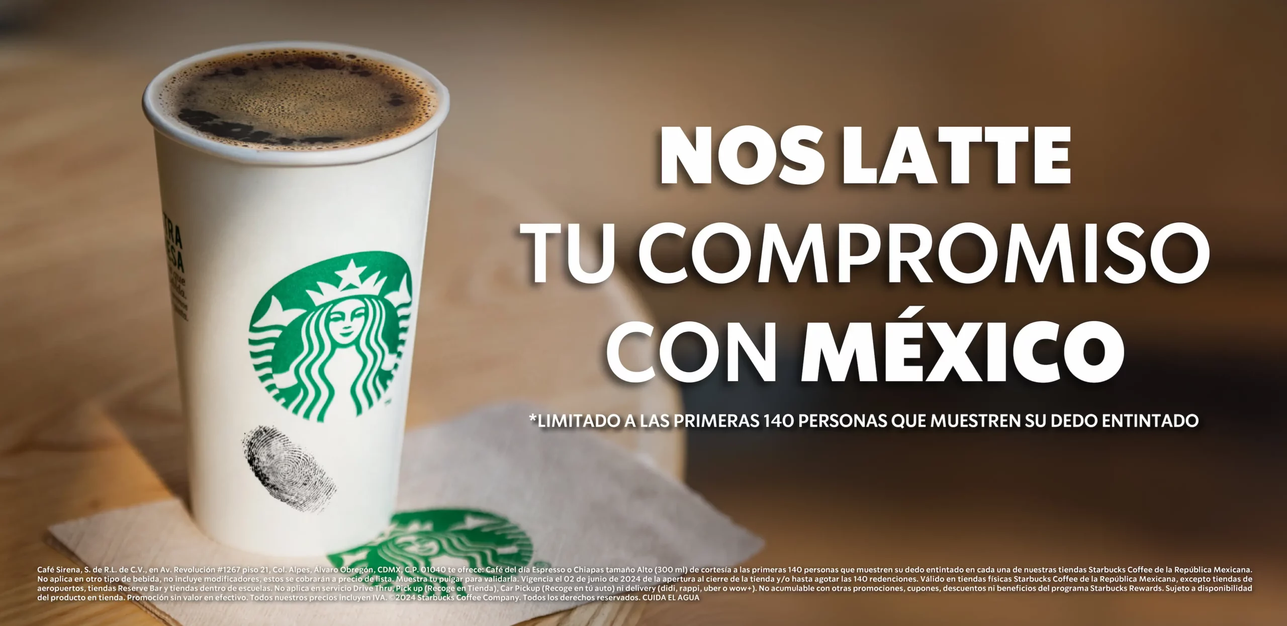 “Nos Latte tu compromiso con México” es la campaña que lanzó Starbucks, indicando que los ciudadanos que muestren su dedo marcado tras emitir su voto se les regalará un café del día tamaño alto gratis, promoción aplicada en todas las sucursales del país.