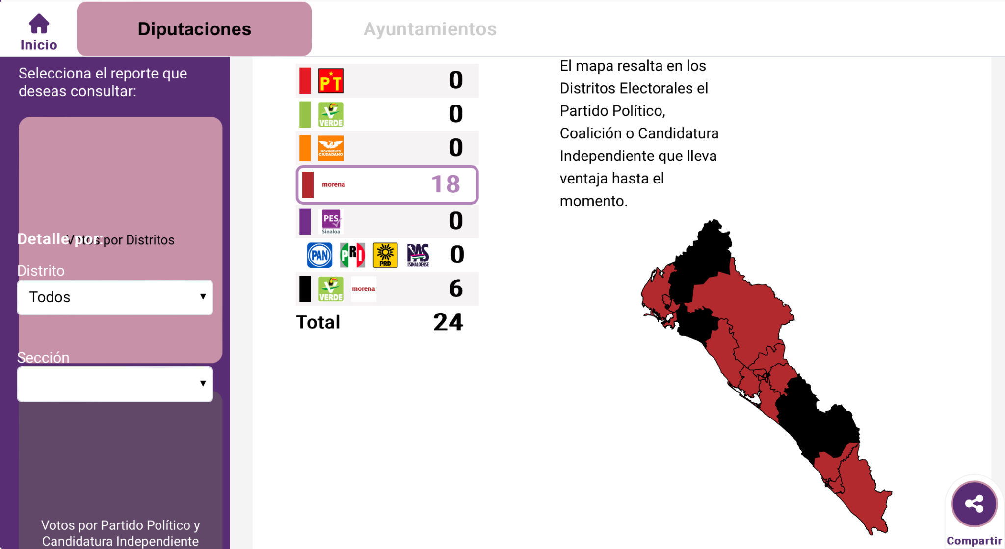 De terminar así el conteo, las 24 curules del Congreso del Estado serían para Morena, compartiendo resultados con el Partido Verde Ecologista de México en los distritos 01, 05, 07, 08, 13 y 19.