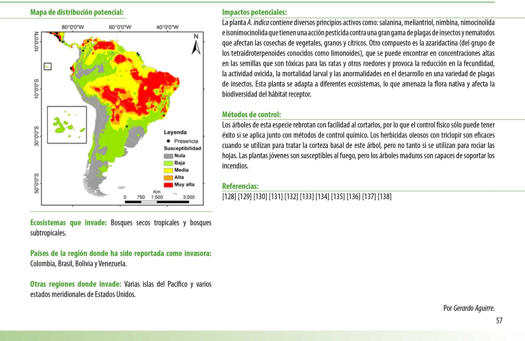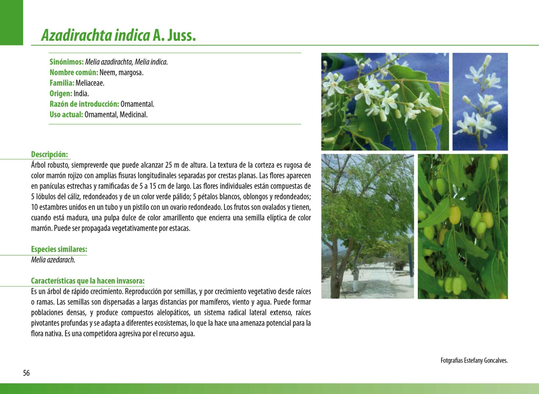 Por su parte, el Manual de Plantas Invasoras de Sudamérica, describió al Neem como una especie invasora que se adapta fácilmente a todos los ecosistemas, convirtiéndose en una amenaza potencial para la flora nativa, además de una competidora agresiva por el agua y cuyos métodos de control solo funcionan si se aplican químicos.