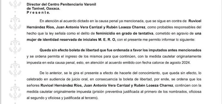 “De lo anterior, se le gira el presente a efecto de hacerle del conocimiento, que queda sin efecto, lo celebrado en audiencia de juicio oral, en consecuencia la boleta de libertad, por ende, se ordena que los señores Ruvicel Hernández Ríos, Juan Antonio Vera Carrizal y Rubén Loaeza Charrez, continúen con la medida cautelar originalmente impuesta (prisión preventiva justificada al primero de los nombrados, oficiosa al segundo y oficiosa y justificada al tercero)”.