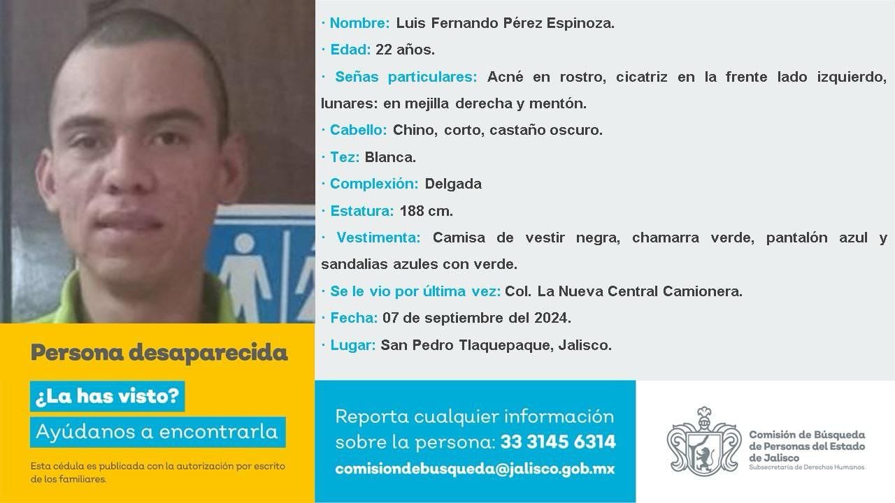 - Luis Fernando Pérez Espinoza, edad 22 años. Fecha de desaparición: 7 de septiembre de 2024.