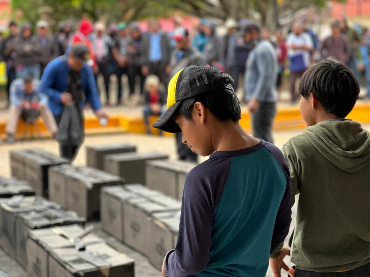 Los colocaron en el lugar donde quedó quemado un auto, y donde aún se pueden ver en las paredes los disparos de armas de grueso calibre y restos de paredes quemadas, producto de los enfrentamientos que hubieron entre las autodefensas El Machete y el Ejército Civil Indígena. Ahí se reunieron mujeres, hombres y adolescentes de las comunidades del municipio.
