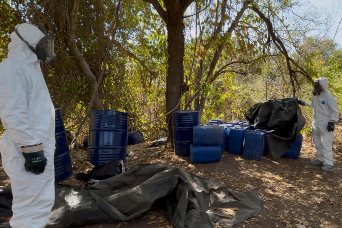 Por otro lado, en el municipio de Sinaloa, elementos del Ejército Mexicano aseguraron 10 mil 700 litros y 1 mil 700 kilos de sustancias químicas, así como dos reactores de síntesis orgánica, cuatro mezcladoras y dos condensadores, utilizados en la producción de drogas sintéticas. De acuerdo con estimaciones oficiales, el valor de los precursores químicos y drogas decomisadas asciende a los 279 millones de pesos.