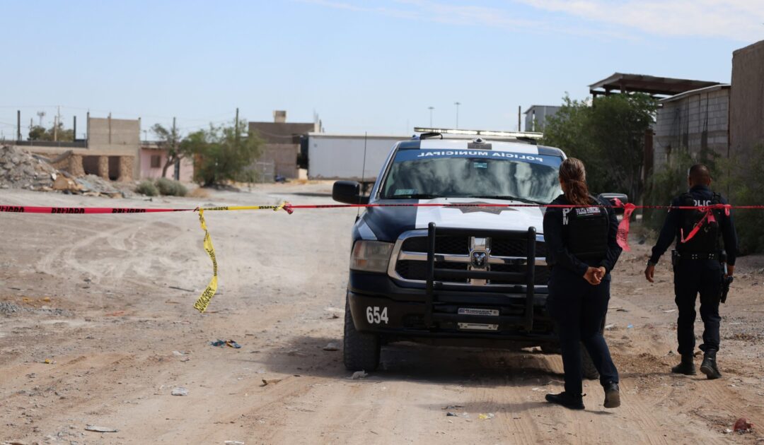 La zona donde opera el crematorio permanece acordonada y resguardada por policías municipales, al fondo se observa una caja de tractocamión equipada con un sistema de refrigeración donde se depositaron los cuerpos localizados. Fotografía: Migue Silerio / La Verdad Juárez