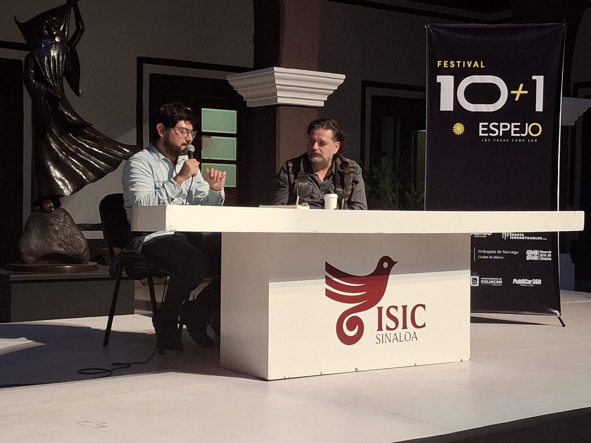 Culiacán, Sin.- Durante la tarde del 5 de diciembre, como cierre del Festival 10+1 conmemorativo del onceavo aniversario de Revista ESPEJO, se realizó la presentación del libro En la Montaña, de autoría del periodista y cineasta Diego Enrique Osorno. En esta obra, Osorno documenta el viaje que un grupo de zapatistas emprendió por el océano hacia territorio europeo y narra la última entrevista concedida por el narcotraficante Ismael “El Mayo” Zambada antes de su arresto.