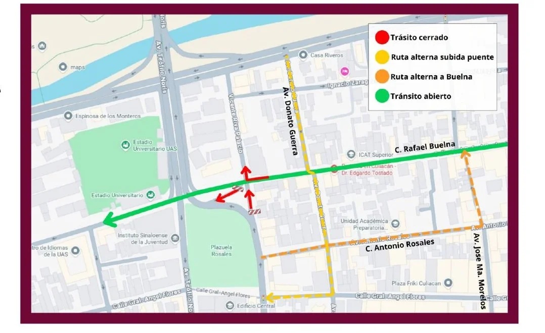 Entre ellos el ingreso al puente Juan de Dios Bátiz desde Rafael Buelna, la avenida Riva Palacio con dirección a Rafael Buelna y la vuelta derecha de Rafael Buelna hacia el Malecón. Ante ello, se recomienda a la ciudadanía tomar precauciones y considerar rutas alternas.