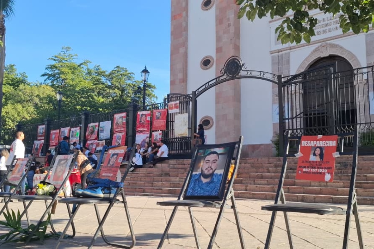 Culiacán, Sinaloa.- Sobre la banqueta de la calle Álvaro Obregó, justo frente a Catedral, se extiende una hilera de sillas con fotografías de personas que se encuentran desaparecidas, cada una de ellas representa un recordatorio de que hay personas que están ausentes y familias que continúan buscandolas.