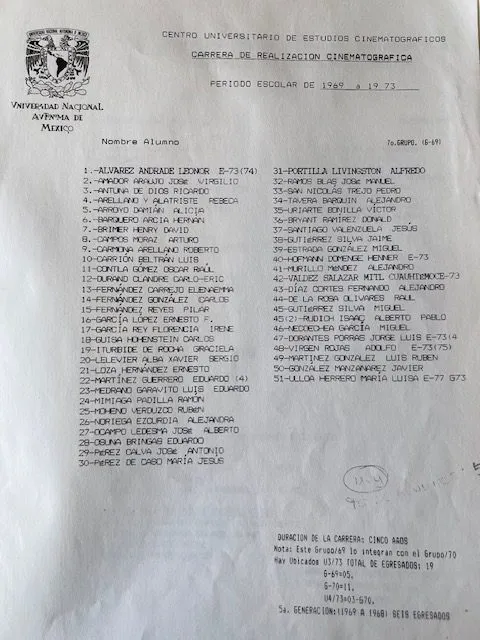 Esta es la lista es de la generación con la que ingreso al CUEC Generación G-69. Cortesía Acervo fílimico de la ENAC.