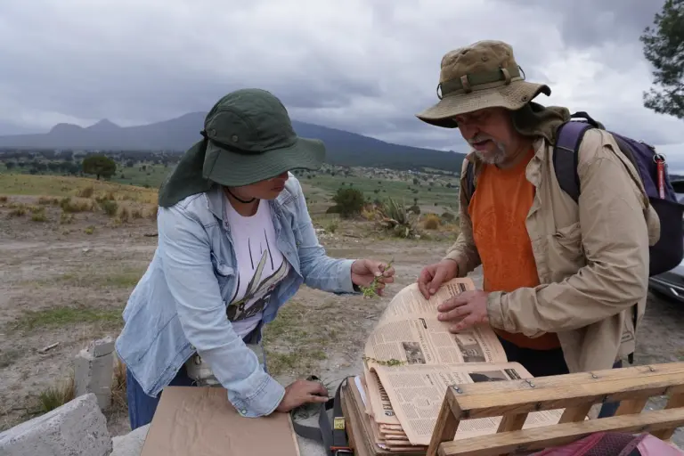 Carlos Martorell Delgado revisando literatura, atrás se encuentran algunas de las plantas encontradas en el récord de diversidad de pastizales en México. (Fotografía: Riza Sánchez).