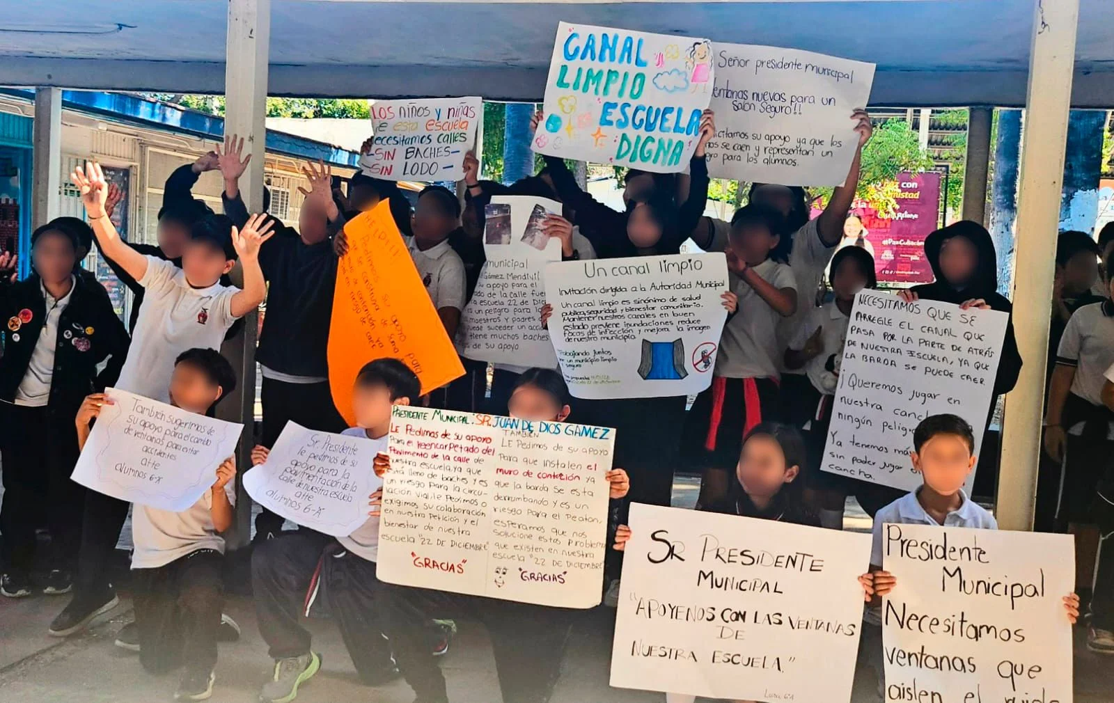 Jennifer, alumna de cuarto grado, junto con otros niños, sostenía un cartel en el que solicitaban el apoyo del presidente municipal para que las ventanas del plantel fueran corredizas y aislantes de sonido. Explicaron que hay compañeros dentro del espectro autista que, ante ruidos fuertes, entran en crisis.
