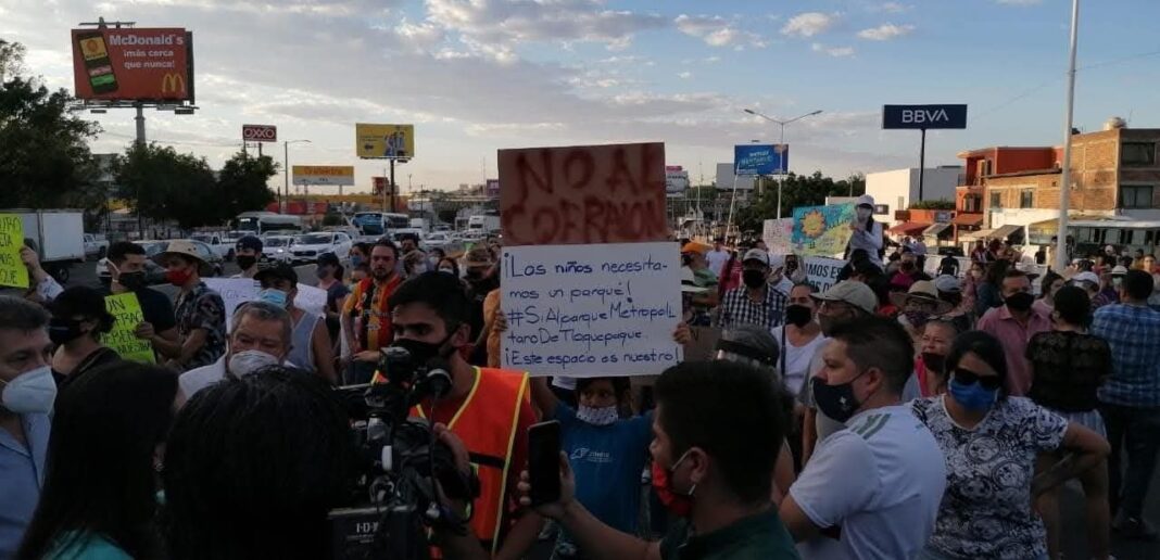 Manifestación y cierre de la vialidad Carretera a Chapala, en el que los vecinos y vecinas exigieron ser escuchado para la construcción del BUT (Autor: Colectivo Vecinal Bosque Urbano Tlaquepaque).