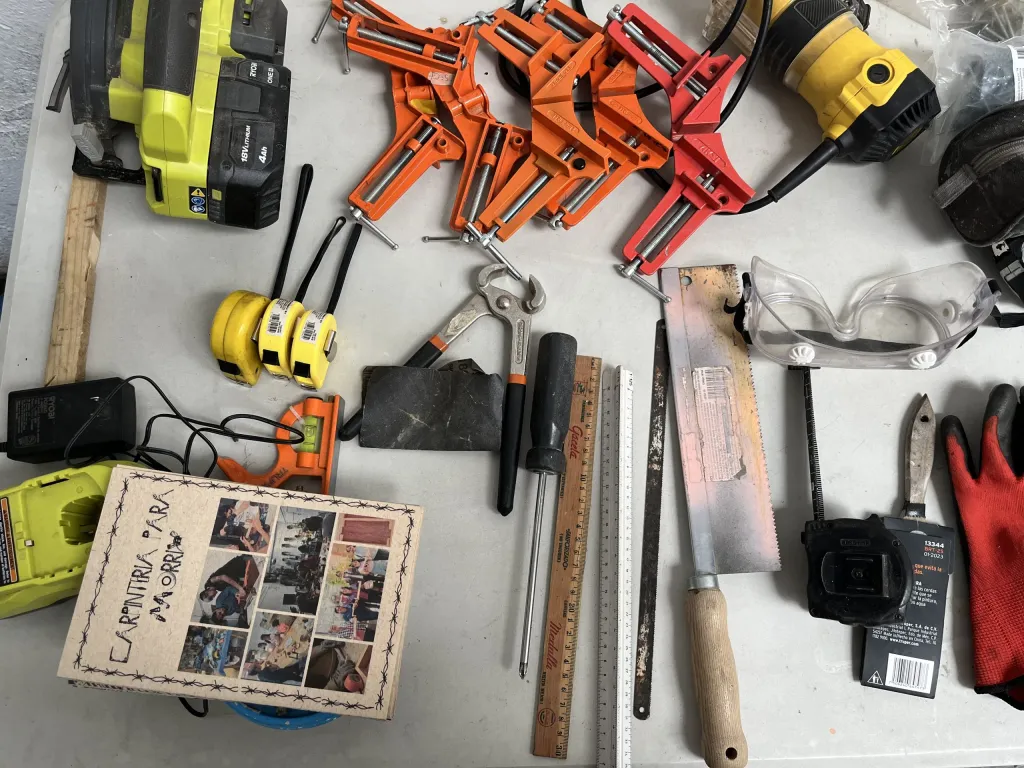 Mesa con distintas herramientas junto con un fanzine de Carpintería para Morrix (foto: Maritza Hernández)