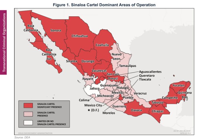 El Cártel de Sinaloa, además de operar en 31 estados de México, tiene presencia en las 50 entidades de Estados Unidos, con miles de traficantes vinculados a su estructura, de acuerdo con la Evaluación Nacional de Amenazas por Drogas 2025, publicada por la Administración para el Control de Drogas (DEA). La agencia describe al cártel como uno de los “más poderosos del mundo” y como uno de los principales productores de fentanilo.
