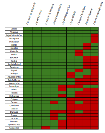 Tabla sobre el cumplimiento de normativas y estructuras institucionales relacionadas con la búsqueda de personas desaparecidas en distintas entidades. Fuente: informe Red Lupa, 2025.