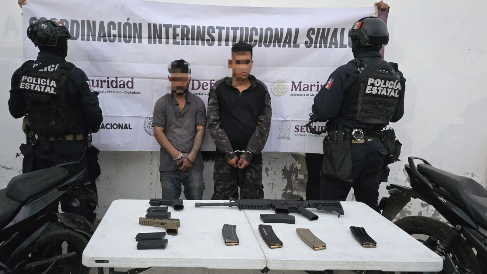 Mazatlán, Sin.- Elementos de seguridad aseguraron a dos civiles, armas de fuego, cargadores, cartuchos y dos motocicletas en la sindicatura de Villa Unión, al sur del municipio de Mazatlán.