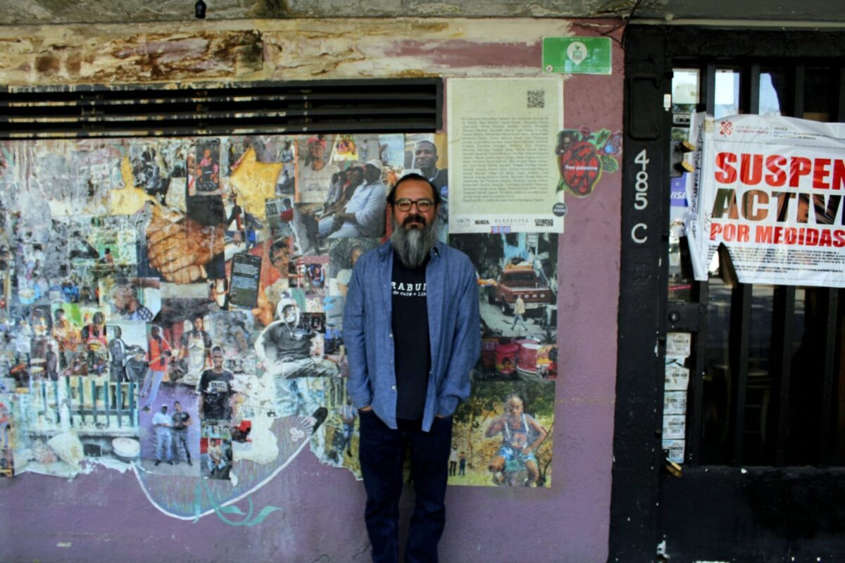 Juan Carlos posa frente a las paredes exteriores de Marabunta, ante un collage fotográfico realizado colectivamente con la comunidad de la Universidad Autónoma de la Ciudad de México (UACM) que visibiliza los rostros de los nuevos vecinos migrantes en la capital.