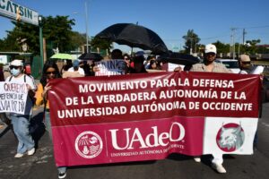 Universitarios de la UAdeO marcharon desde la universidad hacia el Congreso del Estado, en Culiacán, para exigir la restitución del proceso de elección del rector, Pedro Flores. Fotografía: César Ernesto Hernández.